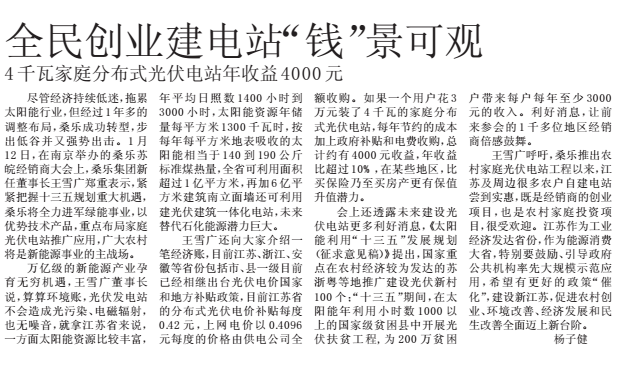 王雪廣還向大家介紹一筆經濟賬,目前江蘇、浙江、安徽等省份包括市、縣一級目前已經相繼出臺光伏電價國家和地方補貼政策,目前江蘇省的分布式光伏電價補貼每度0.42元,上網電價以0.4096元每度的價格由供電公司全額收購。如果一個用戶花3萬元裝了4千瓦的家庭分布式光伏電站,每年節(jié)約的成本加上政府補貼和電費收購,總計約有4000元收益,年收益比超過10%,在某些地區(qū),比買保險乃至買房產更有保值升值潛力。