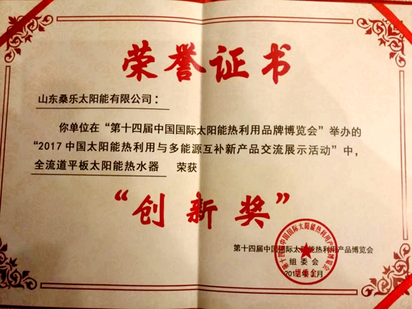 2017中國太陽能熱利用與多能源互補新產(chǎn)品交流展示活動頒獎盛典盛大舉行,桑樂集團在第十四屆中國國際太陽能熱利用產(chǎn)品博覽會上獲得“創(chuàng)新獎”。隨著社會發(fā)展和人民生活改善,特別是進入新常態(tài)以來,創(chuàng)新被國家確立為五大發(fā)展理念之首,國家和社會對太陽能熱利用行業(yè)提出了“鞏固擴大太陽能熱水市場,推動供暖和工農(nóng)業(yè)熱水等領域的規(guī)模化應用,拓展制冷、季節(jié)性儲熱等新興市場,形成多元化的市場格局”的更高要求,太陽能熱利用行業(yè)唯有持續(xù)的創(chuàng)新,才能實現(xiàn)從量到質(zhì)的飛躍,不斷滿足社會發(fā)展對新能源的要求。中國太陽能熱利用產(chǎn)業(yè)聯(lián)盟執(zhí)行理事長張曉黎表示,本次太博會上組委會舉辦創(chuàng)新獎評選,目的是鼓勵和支持創(chuàng)新,鼓勵太陽能熱利用應用在熱水、采暖、工農(nóng)業(yè)新領域。