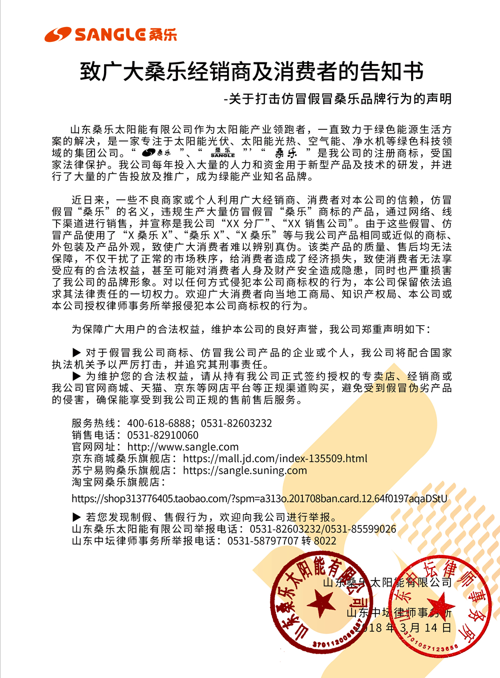 關(guān)于打擊仿冒假冒桑樂(lè)品牌行為的聲明
